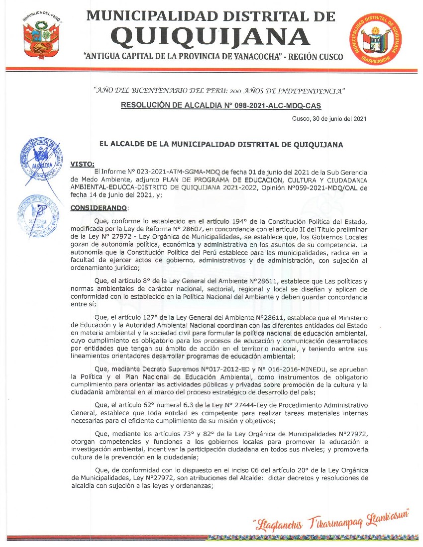La presente Resolución aprueba el Programa Municipal de Educación, Cultura y Ciudadanía Ambiental de la Municipalidad Distrital de Quiquijana, para el periodo 2021-2022; con la finalidad de promover la cultura y la educación ambiental para la formación de ciudadanas y ciudadanos ambientalmente responsables e incentivar la participación ciudadana en todos sus niveles.