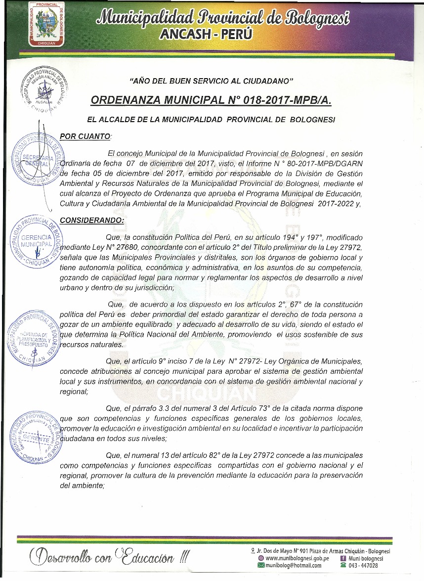 Programa Municipal EDUCCA 2017-2022 MUNICIPALIDAD PROVINCIAL DE BOLOGNESI