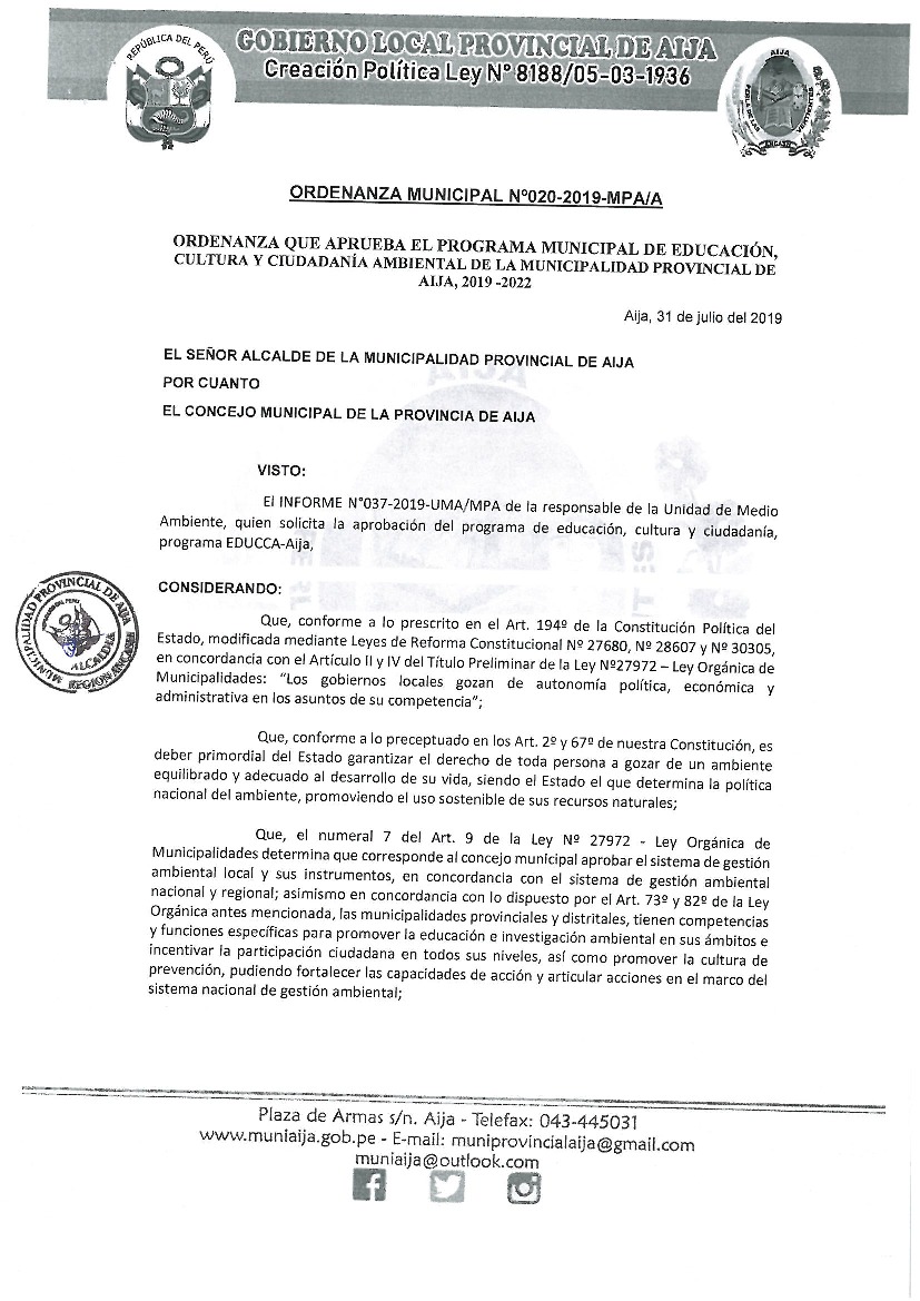 Programa Municipal EDUCCA 2019-2022 MUNICIPALIDAD PROVINCIAL DE AIJA
