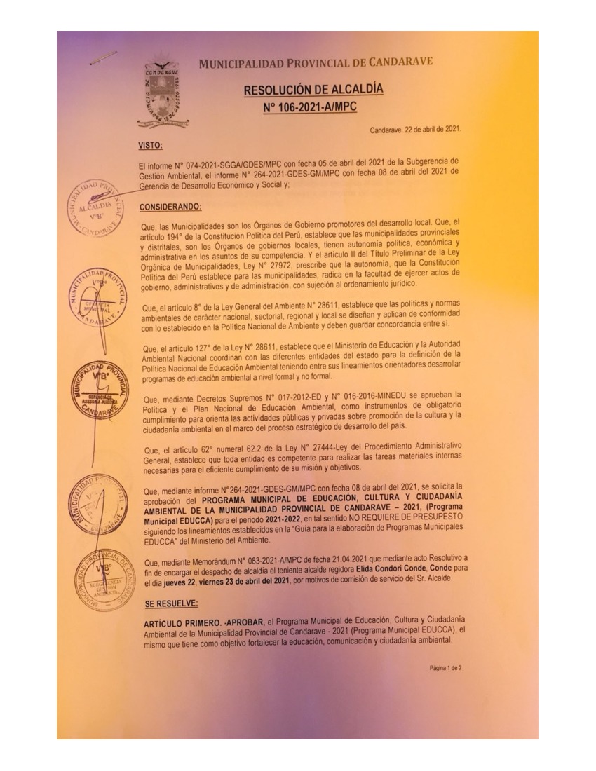 Programa Municipal EDUCCA 2020-2022 MUNICIPALIDAD PROVINCIAL DE CANDARAVE