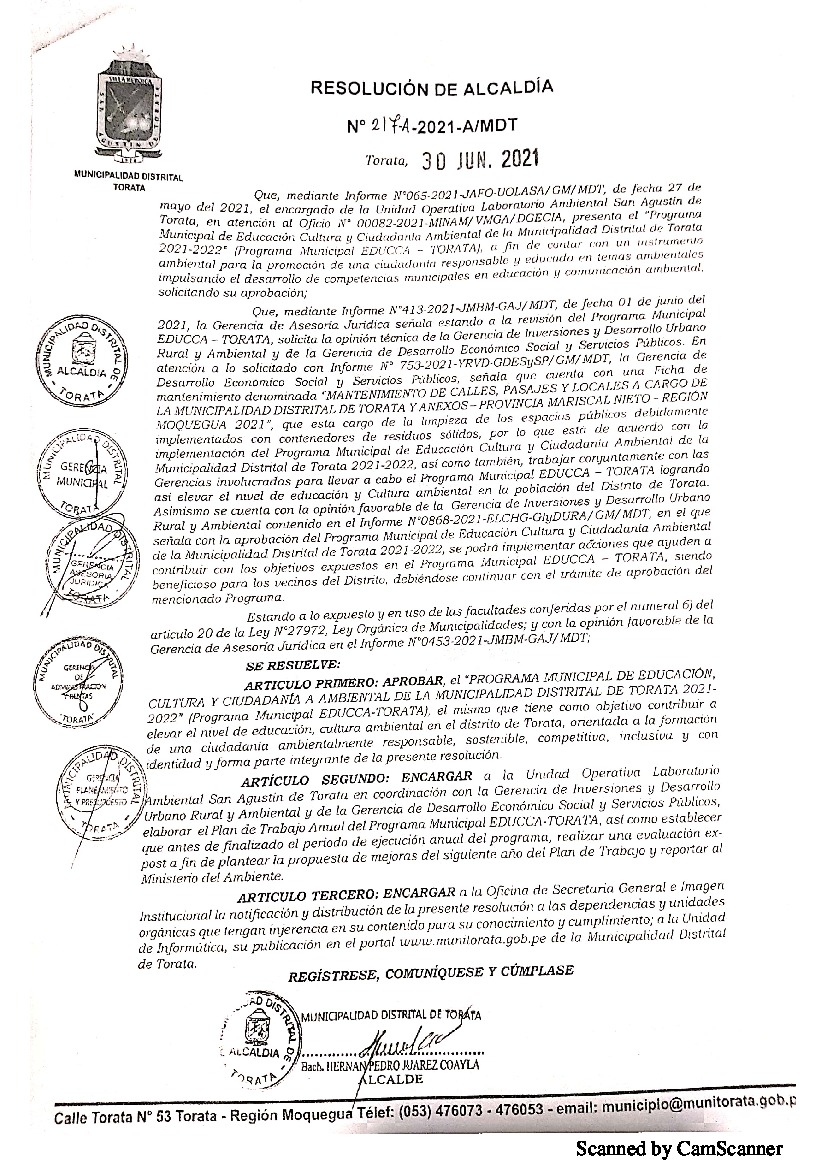 Aprobar su Programa Municipal EDUCCA 2021-2022 de la Municipalidad Distrital de Torata