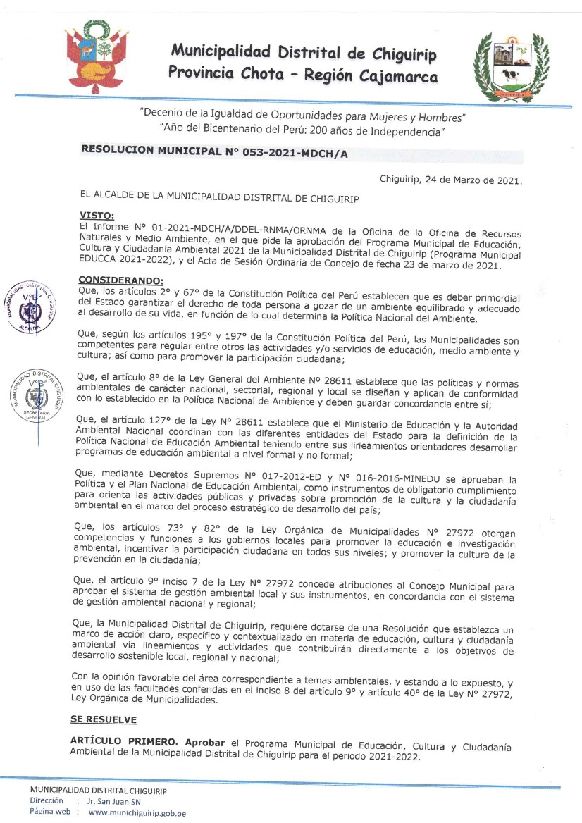 Resolución de Alcaldía N° 053-2021-MDCH/A - Municipalidad Distrital de Chiguirip - Chota