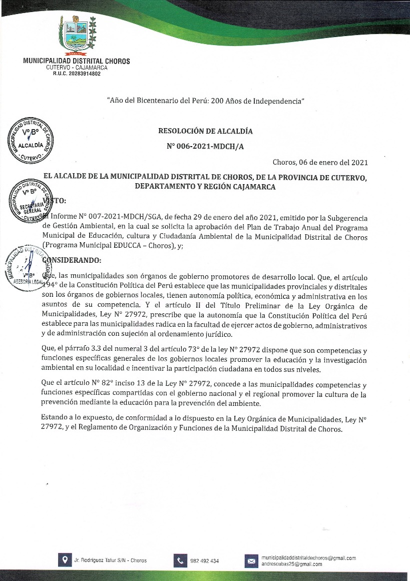 Resolución de Alcaldía N° 006-2021-MDCH/A - Municipalidad Distrital de Choros - Cutervo