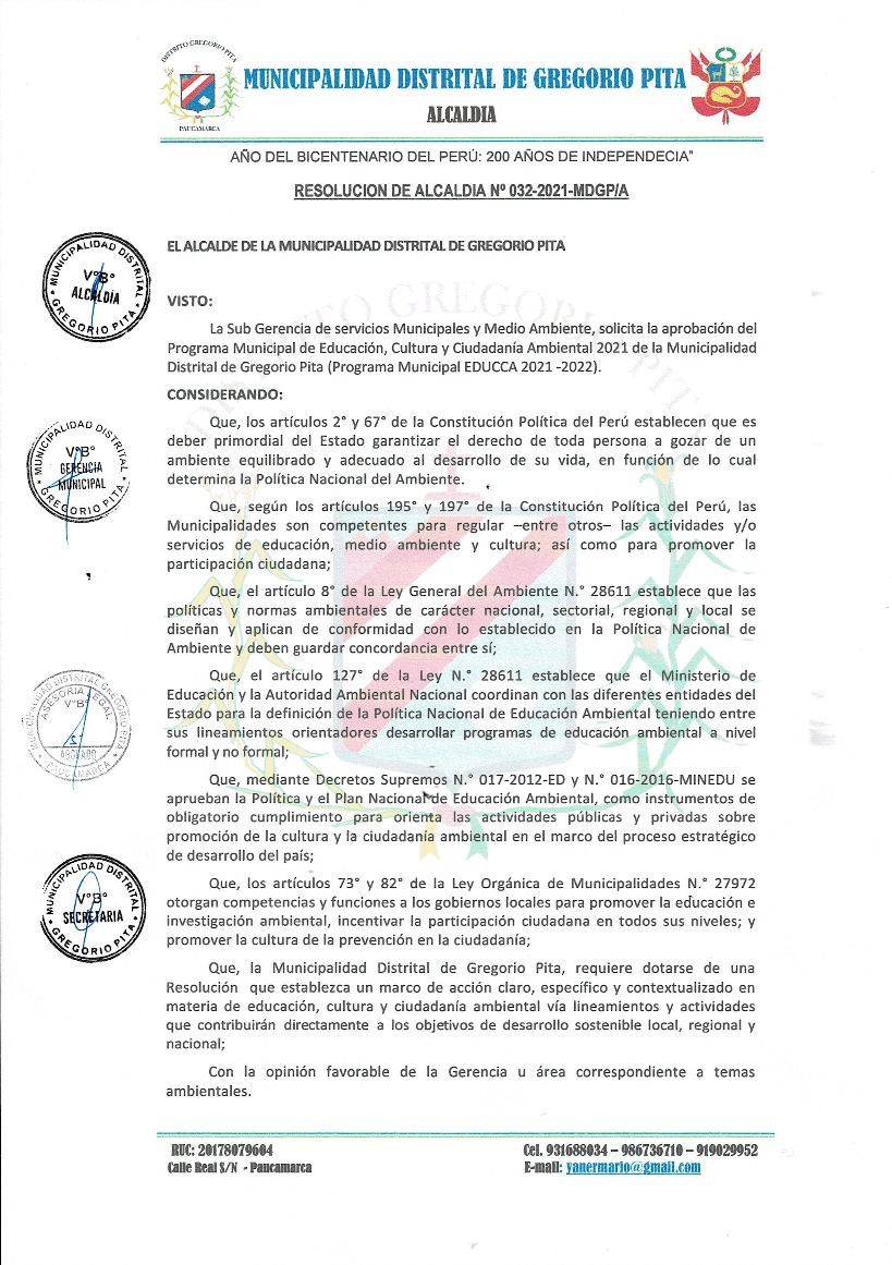 Resolución Alcaldía N° 032-2021-MDGP-A - Municipalidad Distrital de Gregorio Pita - San Marcos