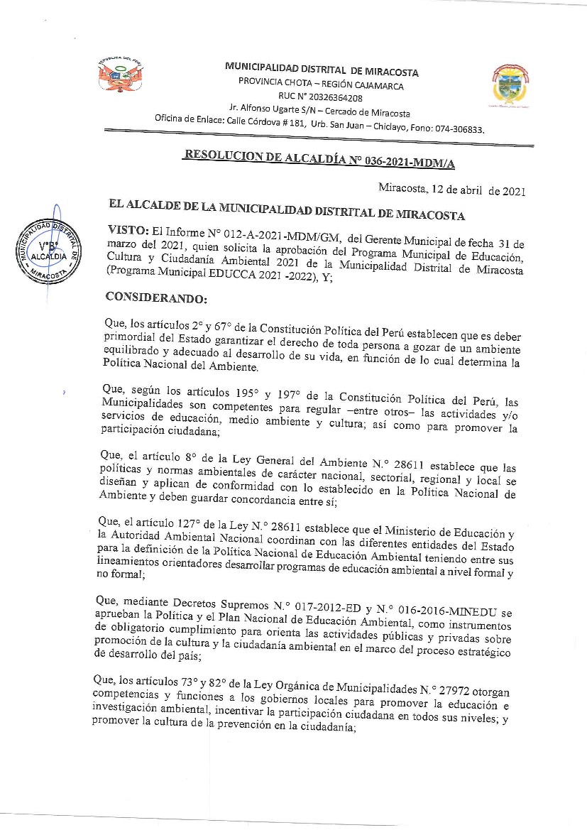 Resolución de Alcaldía N° 036-2021-MDM/A - Municipalidad Distrital de Miracosta - Chota