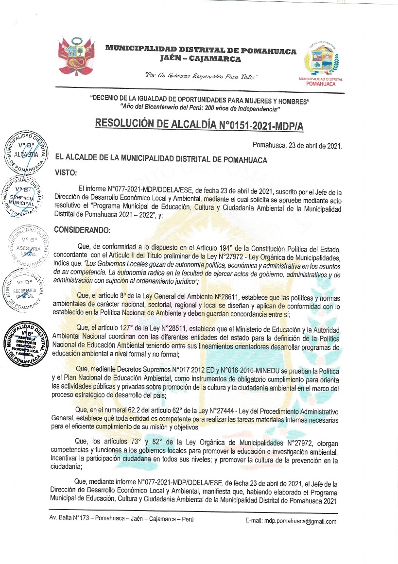 Resolución del Alcaldía N°151-2021-MDP-A - Municipalidad Distrital de Pomahuaca