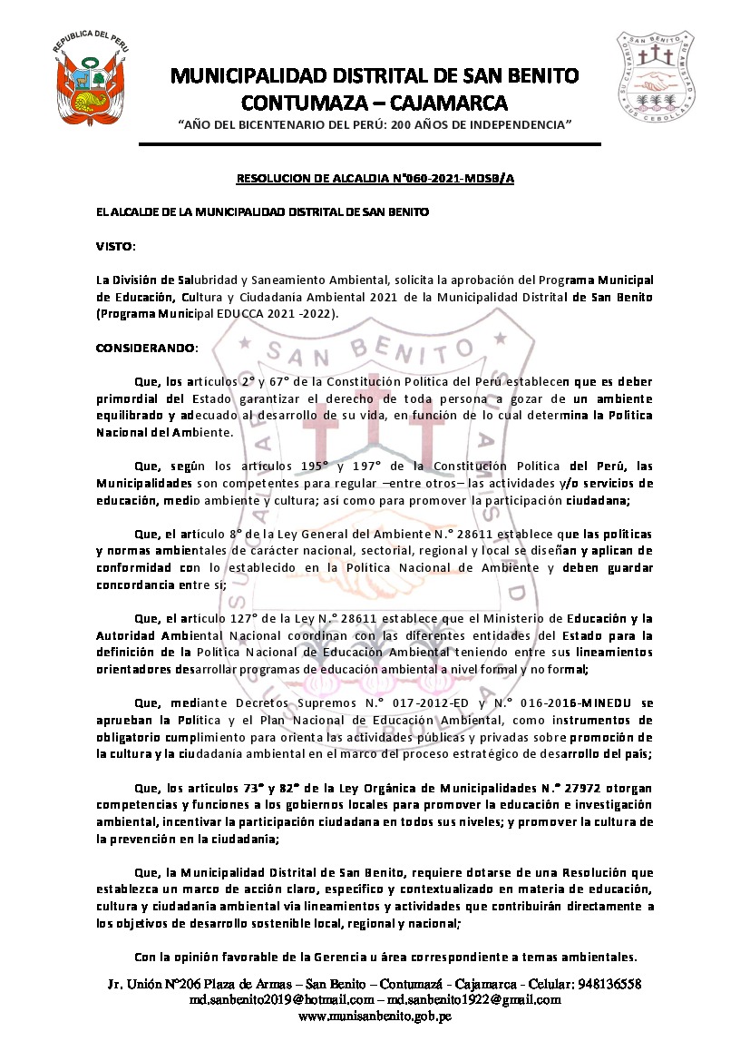 Resolución de Alcaldía N° 060-2021-MDSB/A - Municipalidad Distrital de San Benito - Contumaza