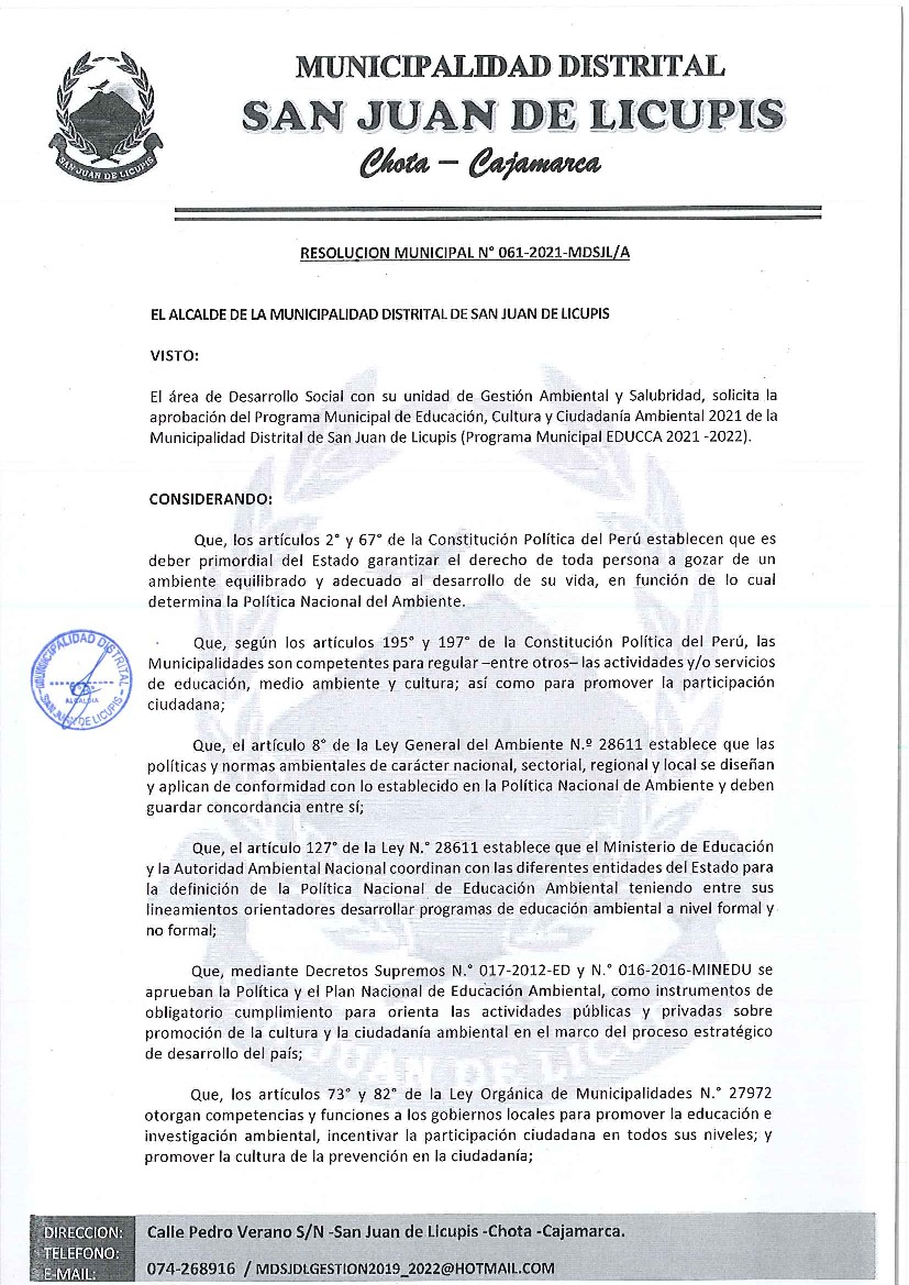 Resolución de Alcaldía N° 061-2021-MDSJL/A - Municipalidad Distrital de San Juan de Licupis - Chota