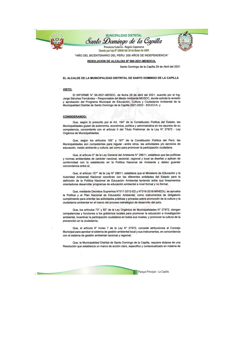 Resolución de Alcaldía N°080-2021-MDSDC-A - Municipalidad Distrital de Santo Domingo de la Capilla - Cutervo