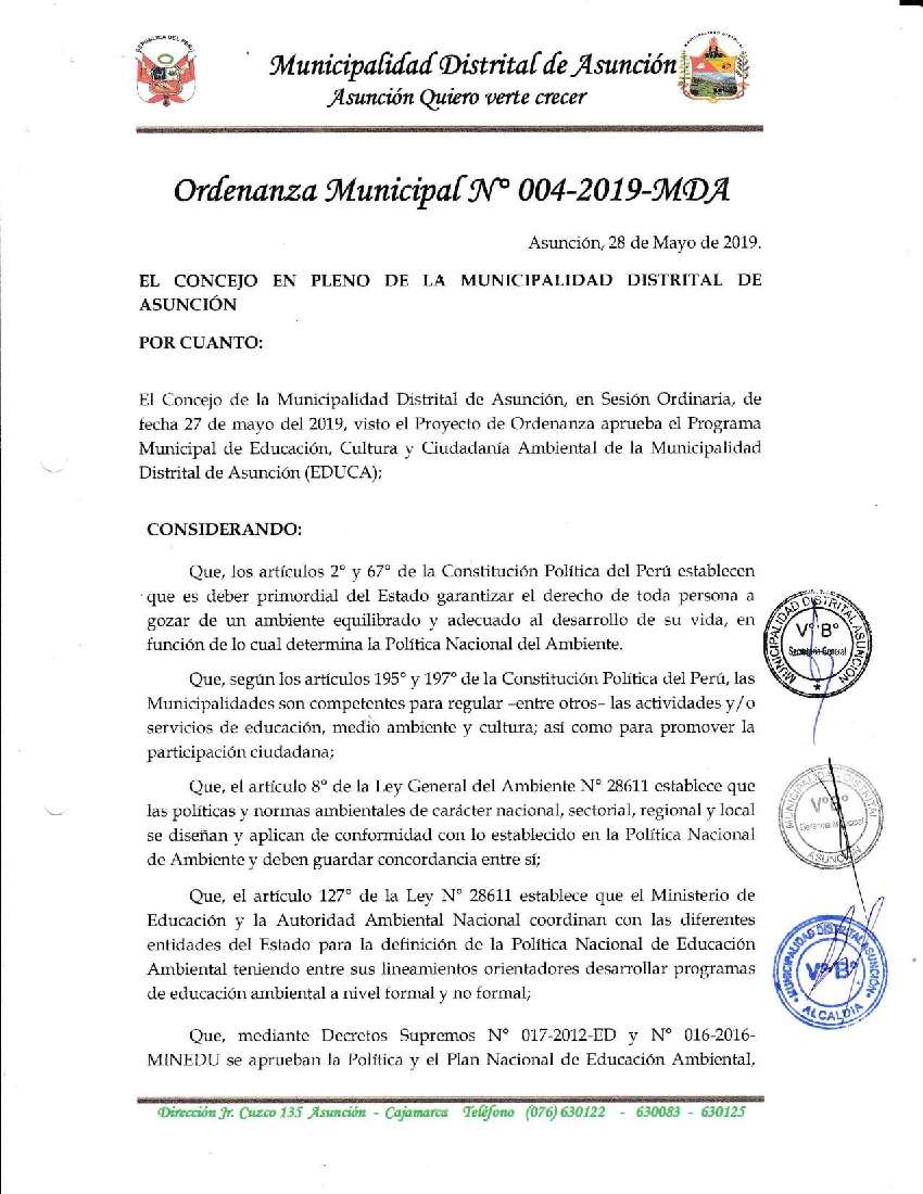 Ordenanza Municipal N° 004-2019-MDA - Municipalidad Distrital de Asunción