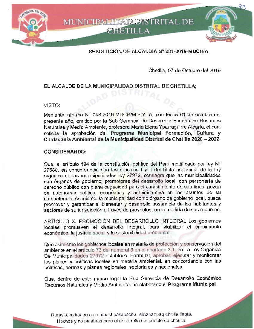 Resolución de Alcaldía N° 201-2019-MDCH/A - Municipalidad Distrital de Chetilla