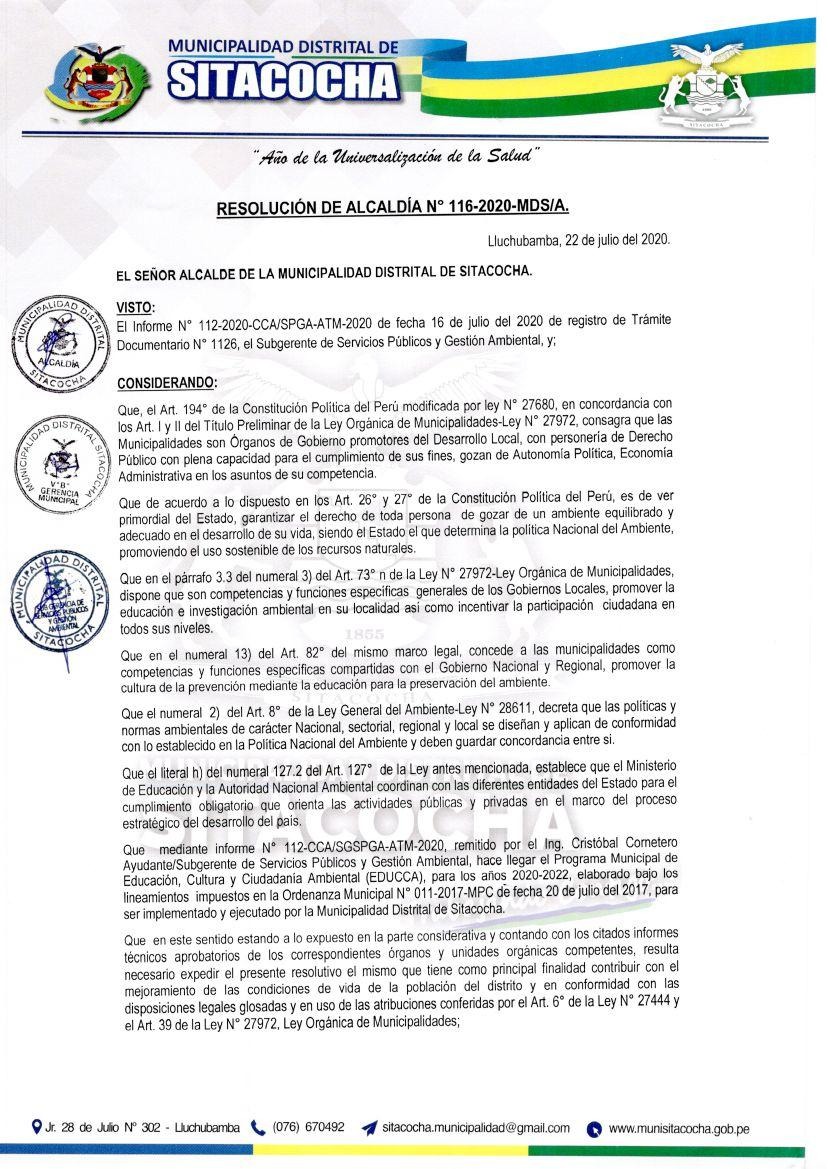 Resolución de Alcaldía N° 116-2020-MDS/A - Municipalidad Distrital de Sitacocha
