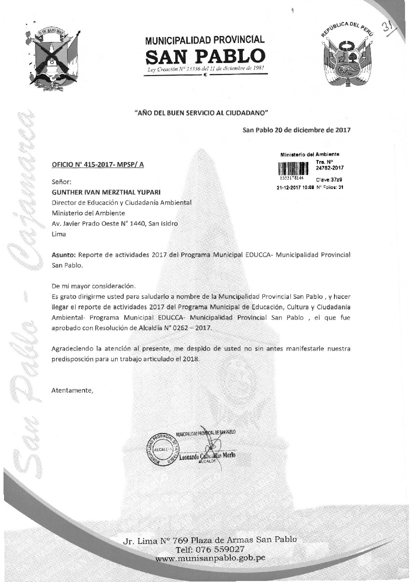 La Municipalidad Provincial de San Pablo remite al MINAM las actividades desarrolladas el 2017 en el marco del Programa Municipal EDUCCA-San Pablo aprobado con Resolución de Alcaldía N° 0262-2017-MPSP/A el 09 de noviembre del 2017