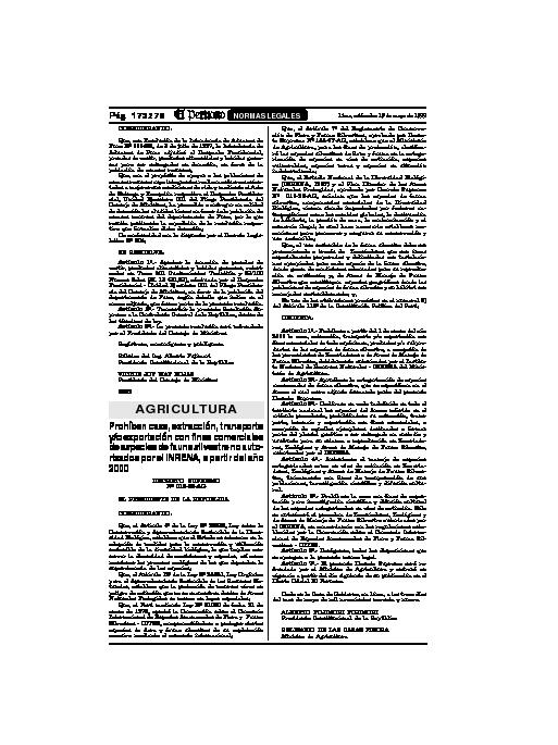 Esta norma prohibe a partir del 1 de enero del año 2000 la caza, extracción, transporte y/o exportación con fines comerciales de todo espécimen, productos y/o subproductos de las especies de fauna silvestre, a excepción de las provenientes de Zoocriaderos o de Áreas de Manejo de Fauna Silvestre, debidamente autorizados por el Instituto Nacional de Recursos Naturales - INRENA del Ministerio de Agricultura. Aprueba también la categorización de especies amenazadas de fauna silvestre, que se especifican en la presente norma formando parte del presente Decreto Supremo.