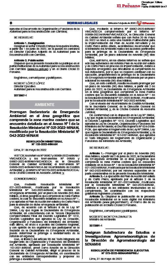 A través de la presente Resolución Ministerial se dispone la Prorroga por el plazo de noventa (90) días hábiles, a partir del 2 de junio de 2022, la Declaratoria de Emergencia Ambiental en el área geográfica que comprende la zona marina costera que se encuentra detallada en el Anexo Nº 1 de la Resolución Ministerial Nº 021-2022-MINAM, modificada por la Resolución Ministerial Nº 042-2022-MINAM.