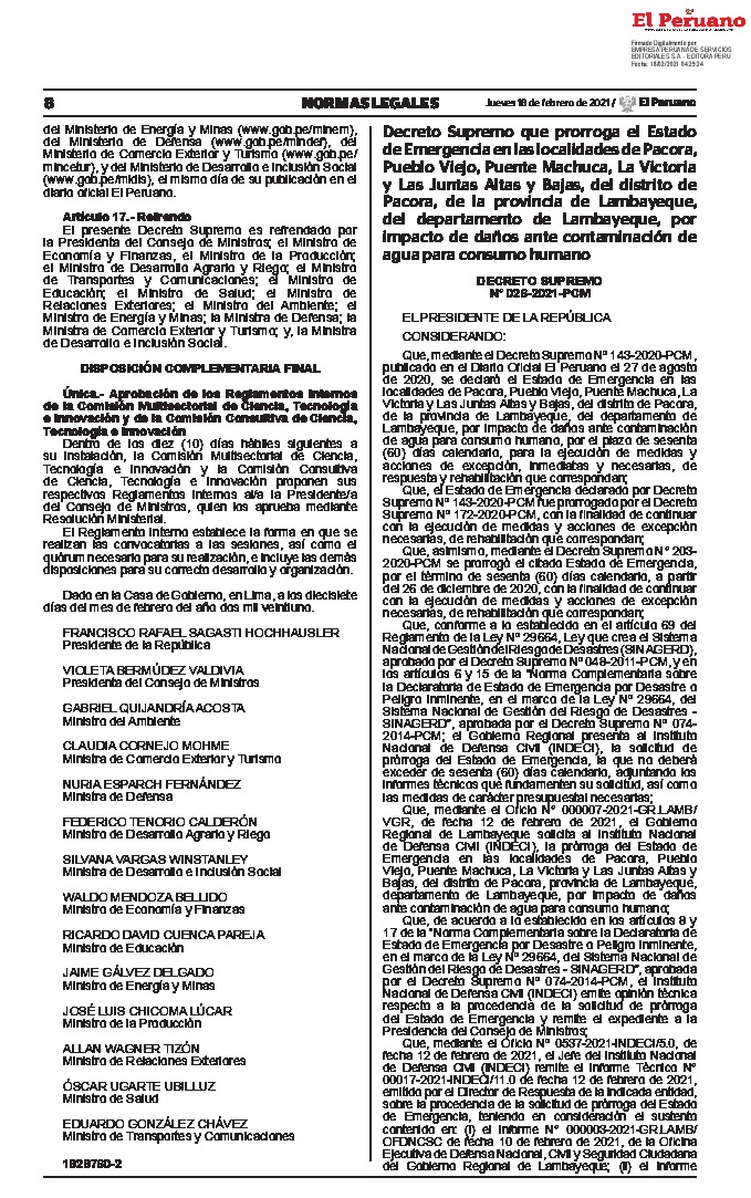 A través del presente Decreto Supremo se prorroga el Estado de Emergencia declarado mediante el Decreto Supremo Nº 143-2020-PCM y prorrogado por el Decreto Supremo N° 172-2020-PCM y el Decreto Supremo N° 203-2020-PCM, en las localidades de Pacora, Pueblo Viejo, Puente Machuca, La Victoria y Las Juntas Altas y Bajas, del distrito de Pacora, de la provincia de Lambayeque, del departamento de Lambayeque, por impacto de daños ante contaminación de agua para consumo humano, por el término de sesenta (60) días calendario, a partir del 24 de febrero de 2021, con la finalidad de continuar con la ejecución de medidas y acciones de excepción necesarias, de rehabilitación que correspondan.