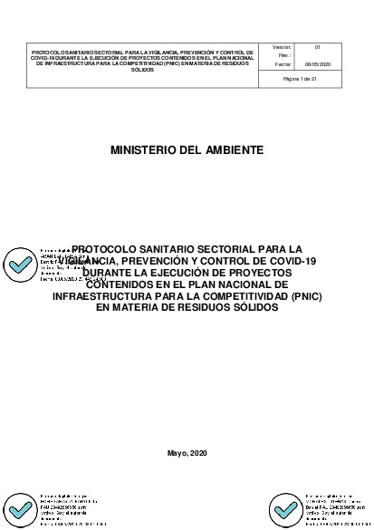 Protocolo sanitario sectorial para la vigilancia, prevención y control de COVID-19 durante la ejecución de proyectos contenidos en el Plan Nacional de Infraestructura para la Competitividad (PNIC) en materia de residuos sólidos