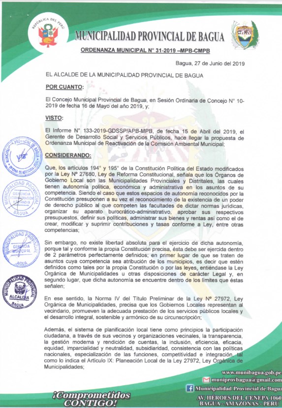 Mediante Ordenanza Municipal N° 031-2019-MPB-CMPB, se aprueba REACTIVAR la Comisión Ambiental Municipal-CAM como la instancia de gestión ambiental de la Provincia de Bagua, encargada de coordinar y concertar la Política Ambiental Local, promoviendo el diálogo y el acuerdo entre los sectores público, privado y sociedad civil, articulando políticas ambientales con la Comisión Ambiental Regional-CAR Amazonas y el Ministerio del-Ambiente MINAM, manteniendo estrecha coordinación con ellas; la cual está conformada por los siguientes miembros: