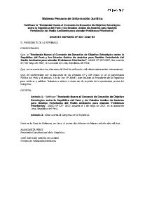 Según Decreto Supremo Nº 007-2010-RE: Ratifícase “Enmienda Nueve al Convenio de Donación de Objetivo Estratégico entre la República del Perú y los Estados Unidos de América para Gestión Fortalecida del Medio Ambiente para atender Problemas Prioritarios”, USAID Nº 527- 0407, suscrita el 7 de mayo de 2007, en la ciudad de Lima, República del Perú.