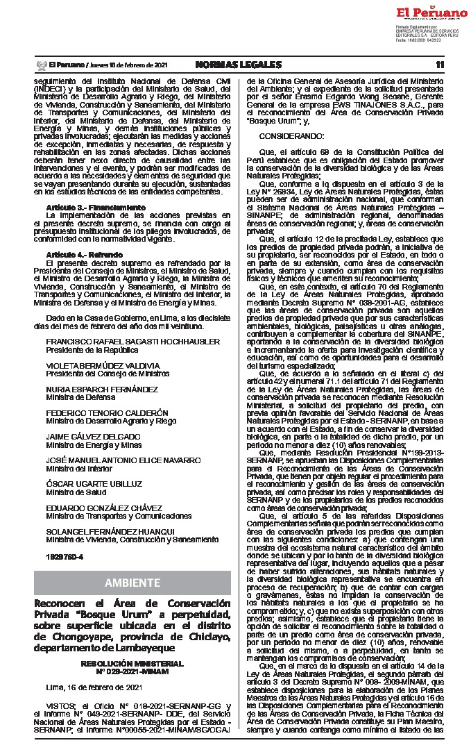Reconocen el Área de Conservación Privada “Bosque Urum” a perpetuidad, sobre superficie ubicada en el distrito de Chongoyape, provincia de Chiclayo, departamento de Lambayeque