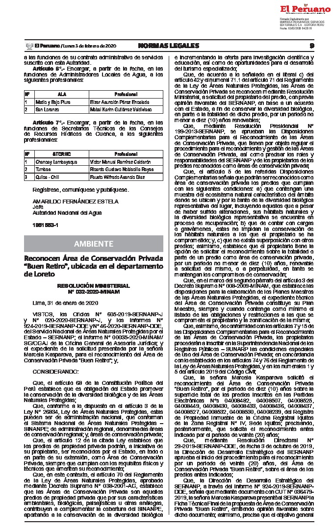 Mediante la presente Resolución Ministerial Reconocer el Área de Conservación Privada “Buen Retiro”, por un periodo de veinte (20) años, sobre la superficie de 67.431 ha, área total de los predios inscritos en las Partidas Electrónicas N°s 04008482, 04008507, 04008525, 04008449, 04008430, 04008433, 04008436, 04008437, 04008527, 04008532, 04008530, 04008239, del Registro de Propiedad Inmueble de la Oficina Registral Iquitos de la Zona Registral N° IV, Sede Iquitos, ubicados en el sector del caserío Buen Retiro – río Marañón, distrito de Nauta, provincia y departamento de Loreto.