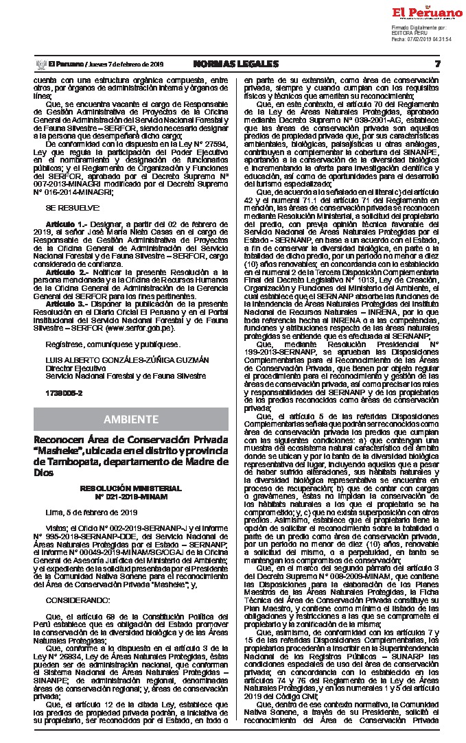 Reconocen Área de Conservación Privada “Masheke”, ubicada en el distrito y provincia de Tambopata, departamento de Madre de Dios