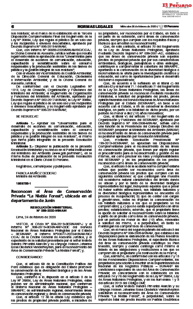 La presente norma reconoce el Área de Conservación Privada “La Niebla Forest”, a perpetuidad, sobre la superficie total del predio inscrito en la Partida Electrónica Nº 11082201 del Registro de Propiedad Inmueble de la Oficina Registral Selva Central de la Zona Registral Nº VIII- Sede Huancayo, ubicado en el distrito de San Ramón, Provincia de Chanchamayo del departamento de Junín.