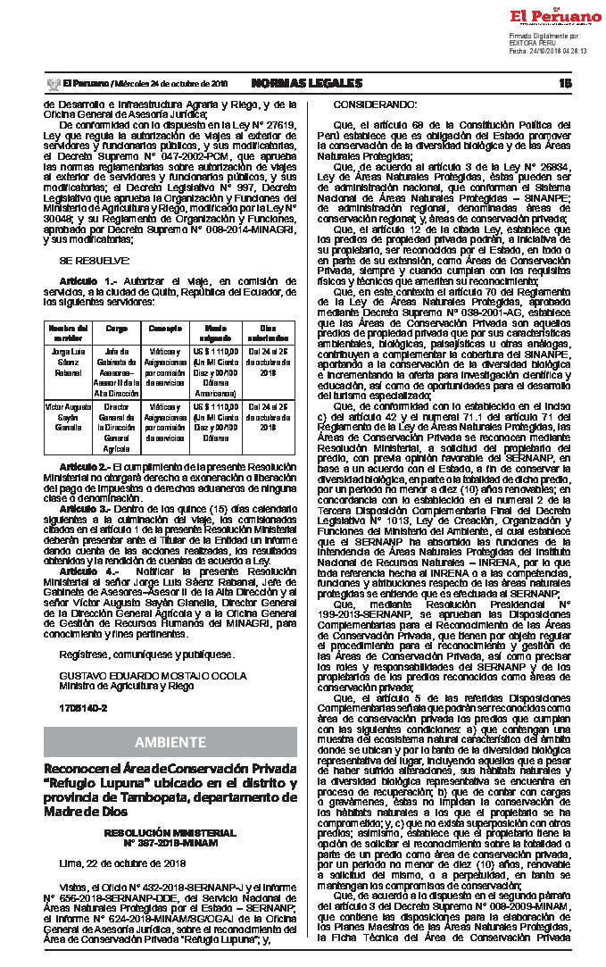 Reconocen el Área de Conservación Privada Refugio Lupuna ubicado en el distrito y provincia de Tambopata departamento de Madre de Dios