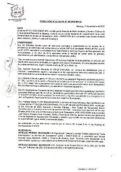 Reconocer a la Organización Comunal y consejo Directivo denominada “Junta Administradora de Servicio de Saneamiento (JASS - KARCATERA) de la comunidad de Juan Velasco Alvardo Anexo Karcatrea. Distrito y Provincia de Abancay, Región Apurímac como responsable de la administración. Operación y mantenimiento de los Servicios Sanemiento de agua potable en dicho lugar.