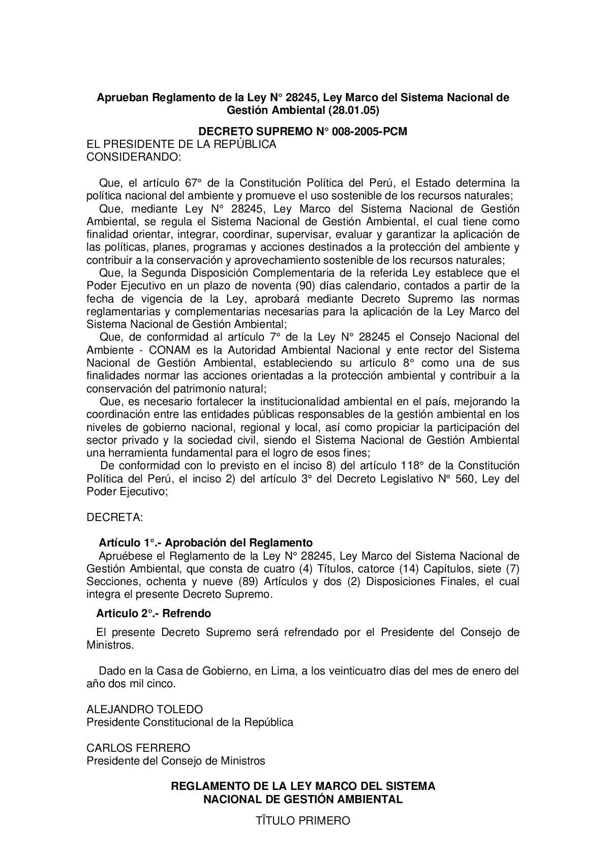 El presente Decreto Supremo Nº 008-2005-PCM. reglamenta la Ley N° 28245, Ley Marco del Sistema Nacional de Gestion Ambiental, regulando el funcionamiento del Sistema Nacional de Gestión Ambiental SNGA, el que se constituye sobre la base de las Instituciones estatales, órganos y oficinas de los distintos ministerios, organismos públicos descentralizados e instituciones públicas a nivel nacional, regional y local que ejerzan competencias, atribuciones y funciones en materia de ambiente y recursos naturales. Los Sistemas Regionales y Locales de Gestión Ambiental forman parte integrante del SNGA, el cual cuenta con la participación del sector privado y la sociedad civil.