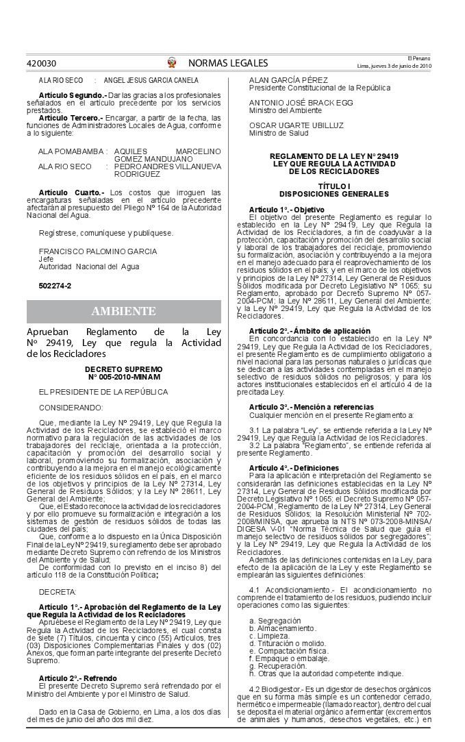 Reglamento de la Ley Nº 29419. Ley que regula la actividad de los recicladores.