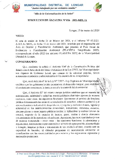 RESOLUCION DE APROBACION DEL PLANEFA 2022 DEL DISTRITO DE LONGAR