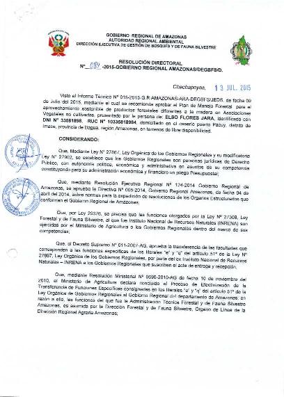 Visto el Informe Técnico N° 015-2015-G.R.AMAZONAS-ARA-DEGBFS/JEDS, de fecha 09 de Julio del 2015, mediante el cual se recomienda aprobar el Plan de Manejo Forestal para el aprovechamiento sostenible de productos forestales diferentes a la madera en Asociaciones Vegetales no cultivadas, presentado por la persona de: ELSO FLORES JARA, identificado con DNI N° 33581898, RUC N° 10335818984, domiciliado en el caserío puerto Pacuy, distrito de Imaza, provincia de Bagua, región Amazonas, en terrenos de libre disponibilidad.