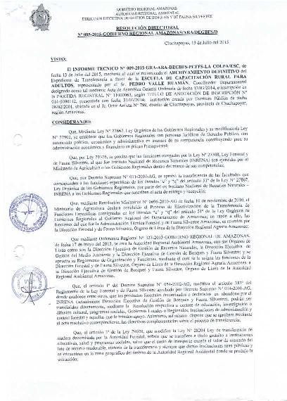 Visto el Informe Técnico N° 009-2015-GRA-ARA-DEGBFS-PCFFS-LA COLPA/ESC, de fecha 13 de Julio del 2015, mediante el cual se recomienda el ARCHIVAMIENTO DEFINITIVO del Expediente de Transferencia a favor de la ESCUELA DE CAPACITACIÓN RURAL PARA ADULTO, representado por el Sr. PEDRO VALLE HUAMAN, Coordinador Departamental designado como tal mediante Acta de Asamblea General Ordinaria de fecha 12/03/2014, e inscripción en la PARTIDA REGISTRAL N° 11000063, según TITULO DE ANOTACIÓN DE INSCRIPCIÓN N° 014-0000112, presentada con fecha 31/03/2014; Institución creada por Escritura Pública de fecha 08/02/2001, ubicada en el Jr. Ortiz Arrieta N° 799, distrito de Chachapoyas, Provincia de Chachapoyas, región Amazonas.