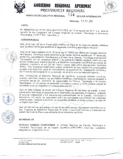Resolución Ejecutiva Regional Lugar Abancay 18 de Setiembre 2012