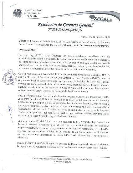 Resolución de Gerencia General Nº 208-2012-SEGAT/GG. Programa: Recolectando Basura que no es Basura.