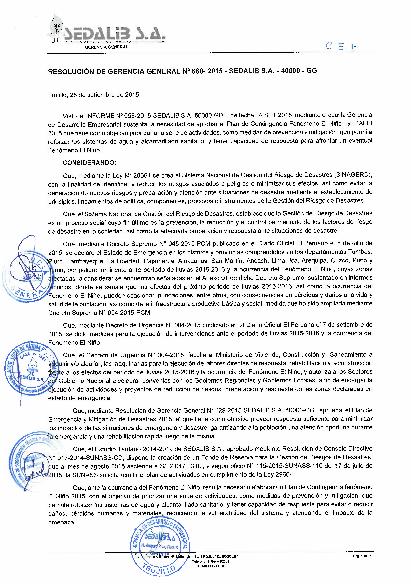 Mediante esta resolución se aprueba el Plan de Contigencia Fenómeno El Niño 2015 de SEDALIB S.A., dispone la instalación del Comité Central de Emergencia (CCE), cuya responsabilidad es la planificación, organización, dirección y control de la operación y mantenimiento de todos los sistemas de agua potable y alcantarillado de la empresa, en respuesta a situaciones de emergencia y mitigación.