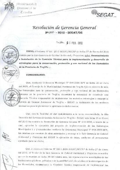 La Resolución de Gerencia General Nº 012-2010-SEGAT/GG reconoce e instala la Comisión Técnica conformada por instituciones públicas, privadas y de la sociedad civil vinculados en la investigación de los Humedales, responsable de implementar las estrategias para la conservación, protección y uso racional de los Humedales ubicados en la provincia de Trujillo.