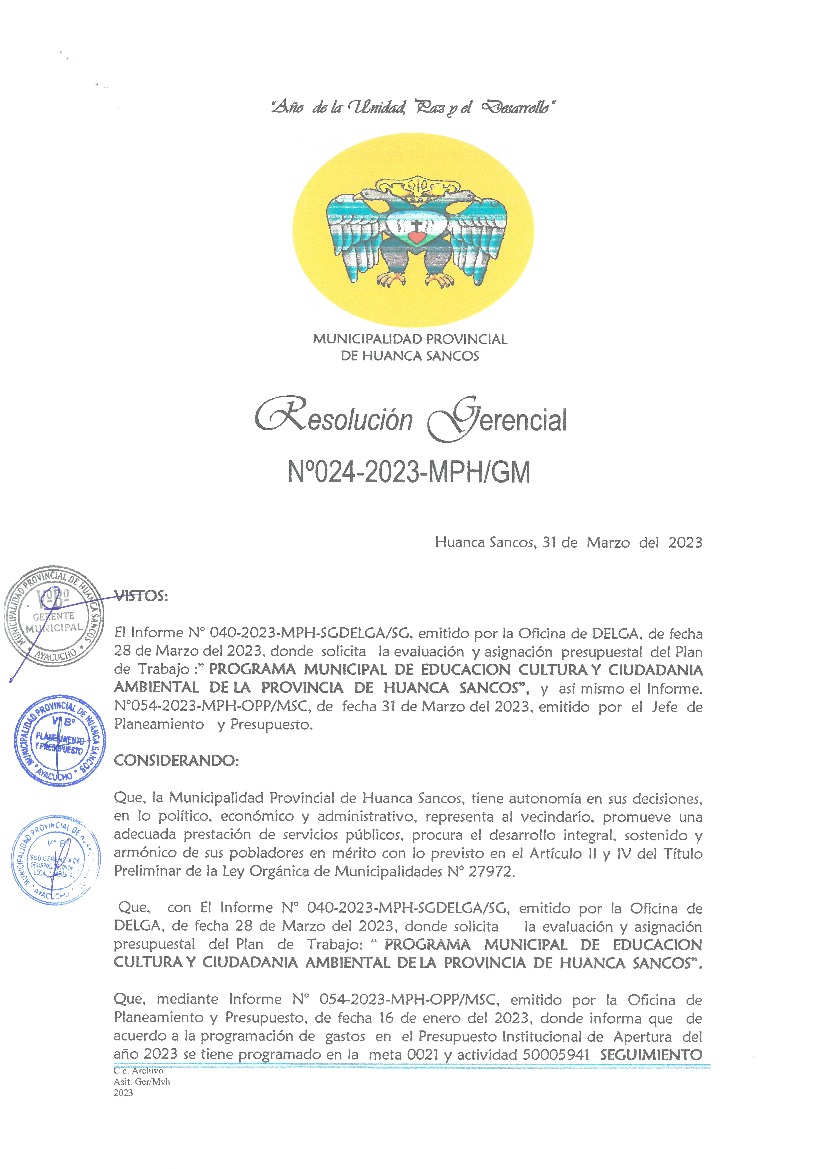 Resolución de Gerencia Municipal que aprueba el Plan de Trabajo 2023 del Programa Municipal EDUCCA – Huanca Sancos