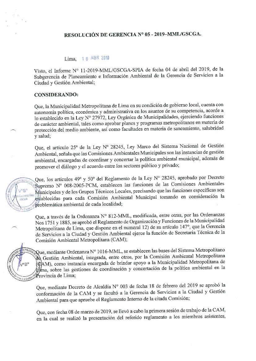 Resolución de Gerencia que aprueba el Reglamento interno de la Comisión Ambiental Metropolitana