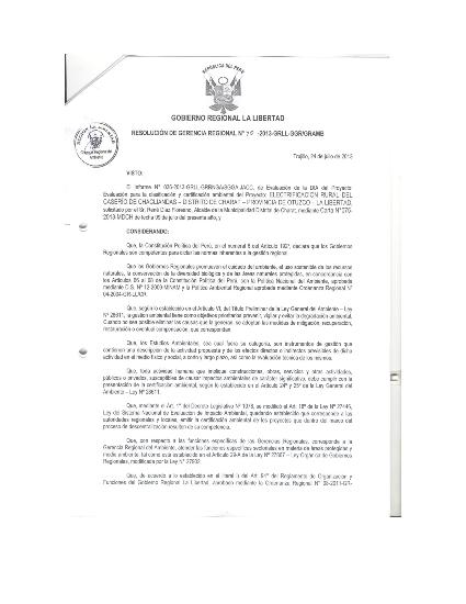 Evaluacióin de la DIA del Proyecto: Evaluación para la clasificación y certificación ambiental del proyecto: ELECTRIFICACIÓN RURAL DEL CASERÍO DE CHACLIANDAS - DISTRITO DE CHARAT - PROVINCIA DE OTUZCO - LA LIBERTAD.