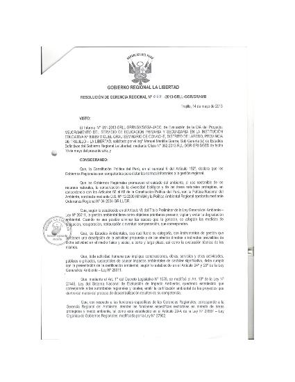 Evaluación de la DIA del Poyecto: MEJORAMIENTO DEL SERVICIO DE EDUCACIÓN PRIMARIA Y SECUNDARIA EN LA INSTITUCIÓN EDUCATIVA N° 80869 MIGUEL GRAU SEMINARIO DE CONACHE, DISTRITO DE LAREDO, PROVINCIA DE TRUJILLO- LA LIBERTAD