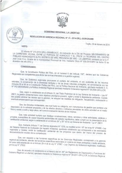 Evaluación de la DIA del Proyecto: "MEJORAMIENTO DE LA CARRETERA VECINAL ENTRE LA PORTADA DE HUANCACO Y EL CRUCE LA RICARDINA DEL CENTRO POBLADO HUANCAQUITO ALTO, DISTRITO DE VIRÚ, PROVINCIA DE VIRÚ- LA LIBERTAD"