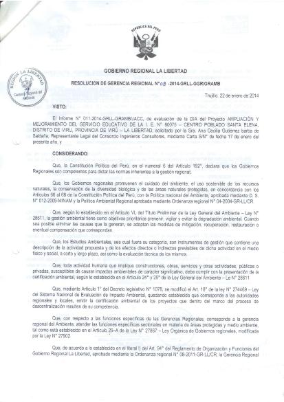 Evaluación de la DIA del Proyecto: "AMPLIACIÓN Y MEJORAMIENTO DEL SERVICIO EDUCATIVO DE LA INSTITUCIÓN EDUCATIVA N° 80075 CENTRO POBLADO - SANTA ELENA - DISTRITO DE VIRÚ - PROVINCIA DE VIRÚ - LA LIBERTAD"