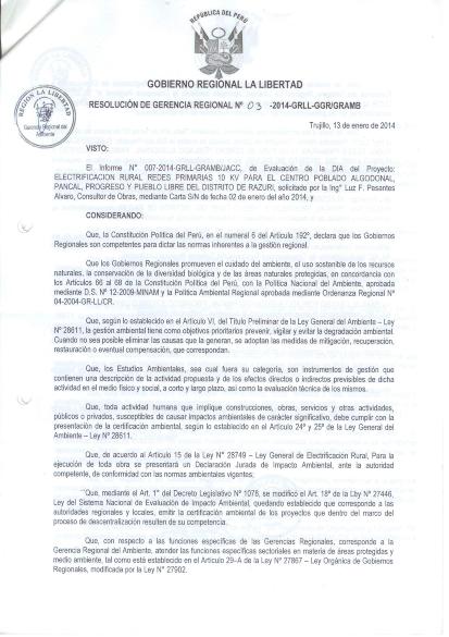 Evaluación de la DIA del proyecto: "ELECTRIFICACIÓN RURAL REDES PRIMARIAS 10 KV PARA EL CENTRO POBLADO ALGODONAL, PANCAL, PROGRESO Y PUEBLO LIBRE DEL DISTRITO DE RAZURI.