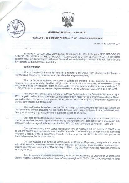 Evaluación del EIAsd del Proyecto: "MEJORAMIENTO DEL SERVICIO DEL SISTEMA DE RIEGO TIRACRA - PAMPARACRA, DISTRITO DE PIÁS, PATAZ LA LIBERTAD"