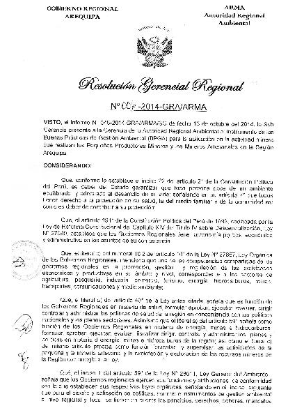 Resolución Gerencial Regional sobre el Instrumento de las Buenas Prácticas de Gestión Ambiental para la Pequeña Minería y Minería Artesanal