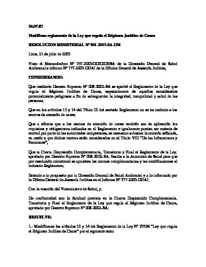 Resolución Ministerial que modifica reglamento de la Ley que regula el Régimen Jurídico de Canes