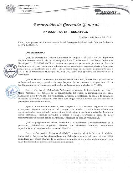 La Resolución de Gerencia General Nº 027-2015-SEGAT/GG que aprueba el Calendario Ambiental del SEGAT para el año 2015, el cual se encuentra adjuntado por fechas y meses en el presente documento. Entre las fechas más destacadas del calendario ambiental son: La Hora del Planeta(26 de marzo), Día de la Tierra(22 de abril), Día Internacional de la Diversidad Biológica( 22 de mayo), Día Mundial del Ambiente (05 de junio) y entre otra.