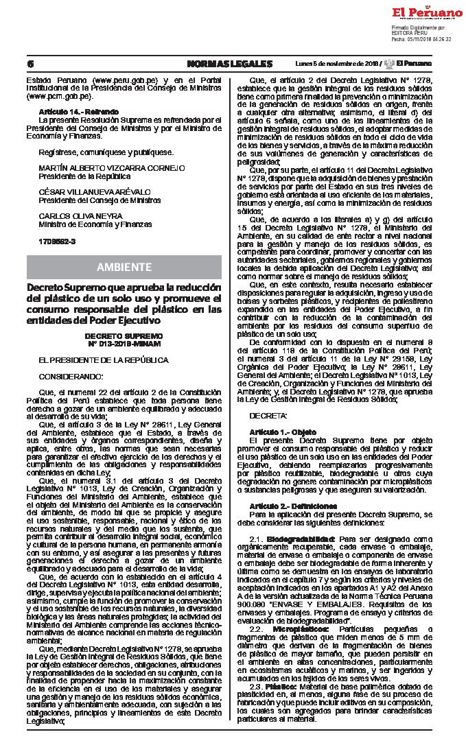 Se aprueba la reducción del plástico de un solo uso y promueve el consumo responsable del plástico en las entidades del Poder Ejecutivo.